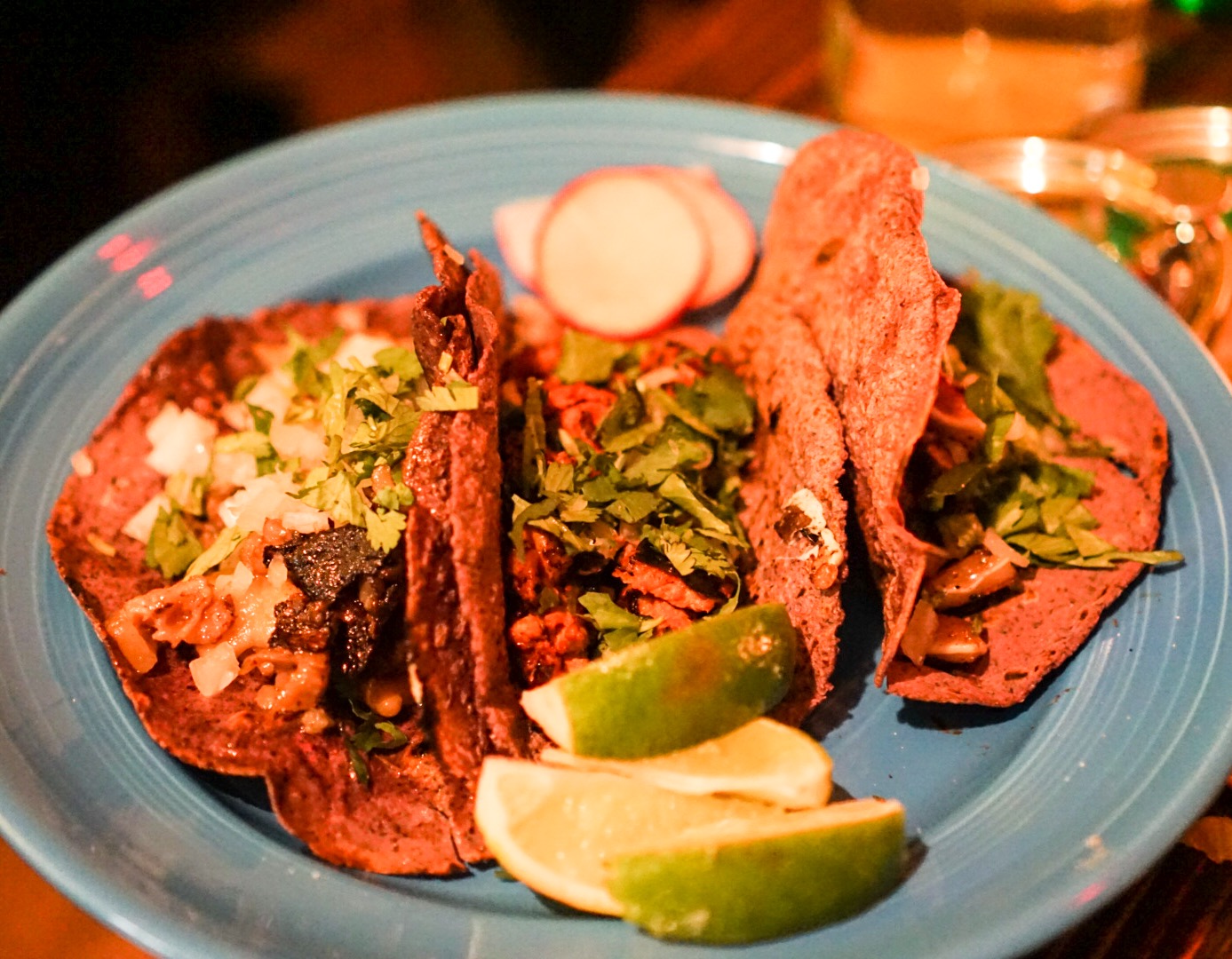 Sweet, spicy and tender – the al pastor is everything you want it to be. I love the simple preparation with onion and cilantro as well as the fresh blue corn tortilla.