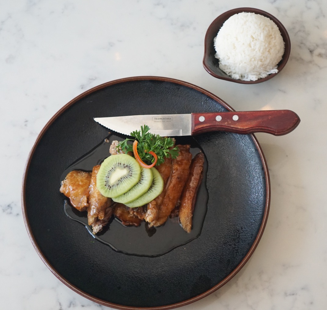Duck Tamarind A tender half duck breast sits under a wonderfully crispy skin. The tangy and slightly sweet tamarind sauce adds a lightness to the dish by cutting the richness of the meat.