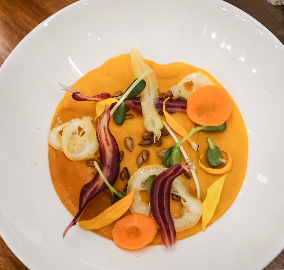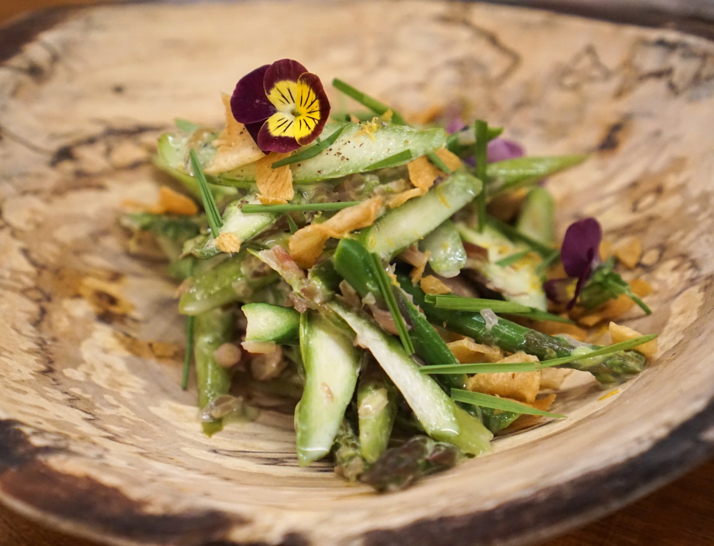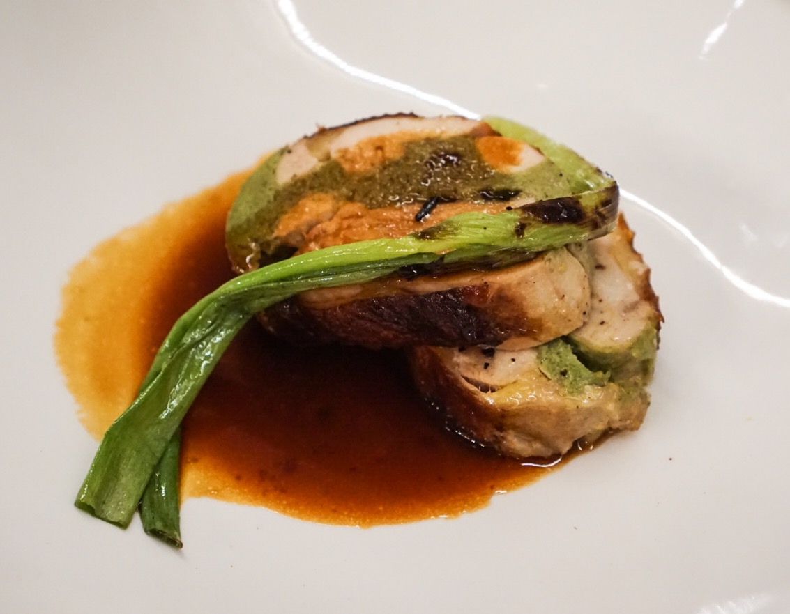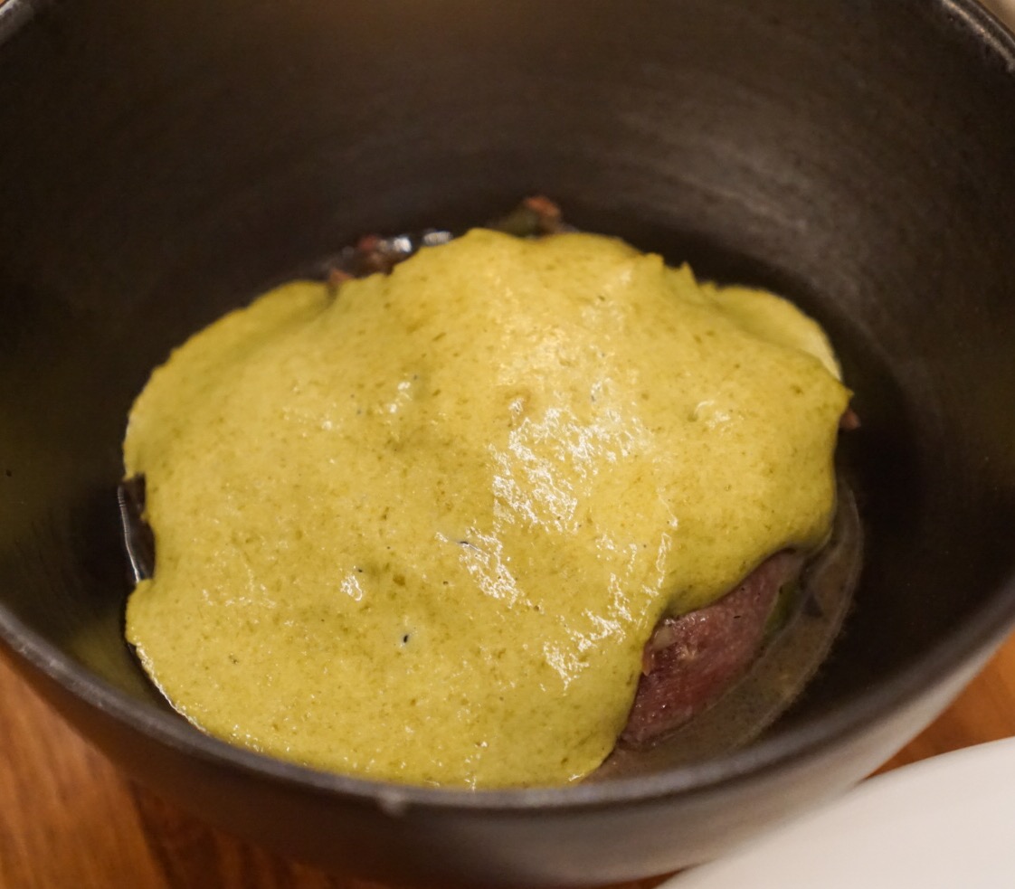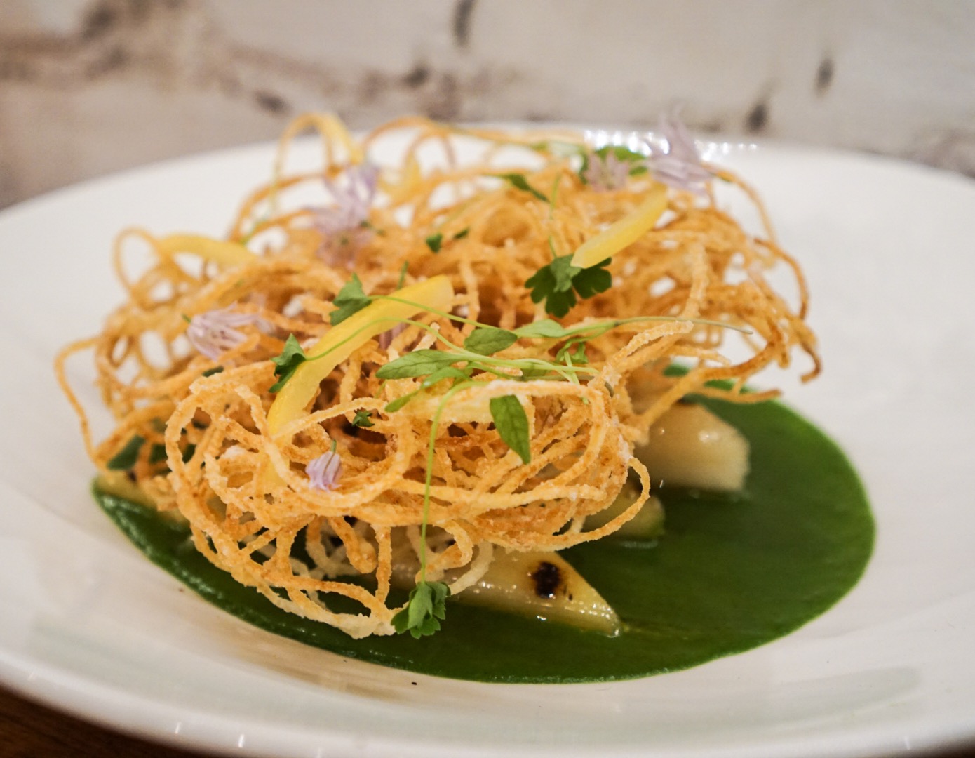 One of the few vegetarian options, this vibrant early summer dish comes in a parsley veloute with crispy potato on top.