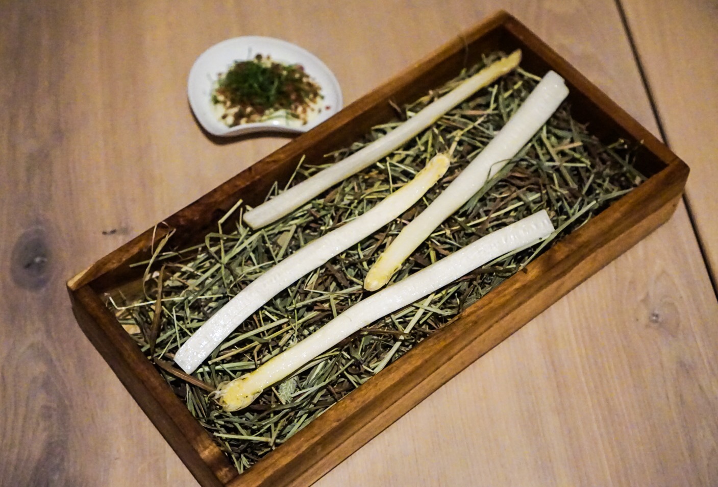 White Asparagus and Coppa The asparagus is raw, but presumably has been soaked because it’s nothing like stalk rocks you buy at the grocery store. Dipping it into the tangy aioli feels like eating a very high end veggie dip.