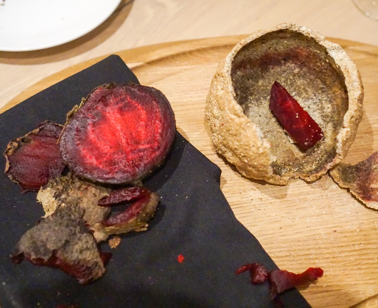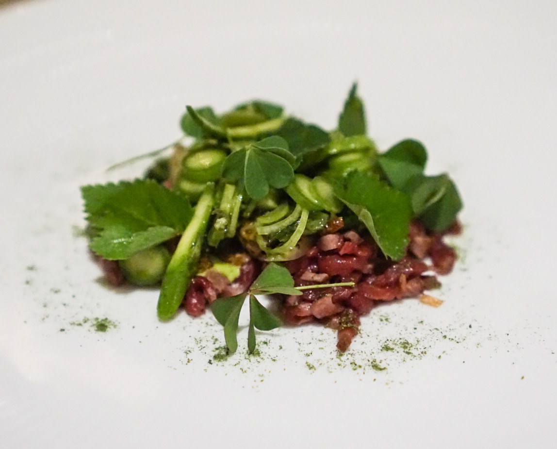 Salt Cured Beet The best presentation award of the night, this arrive in what appears to be a dinosaur egg. Once cracked open by the server, it’s revealed to be salt casing of a ruby red beet. Add some horseradish and huckleberries and you’ve got a winner.