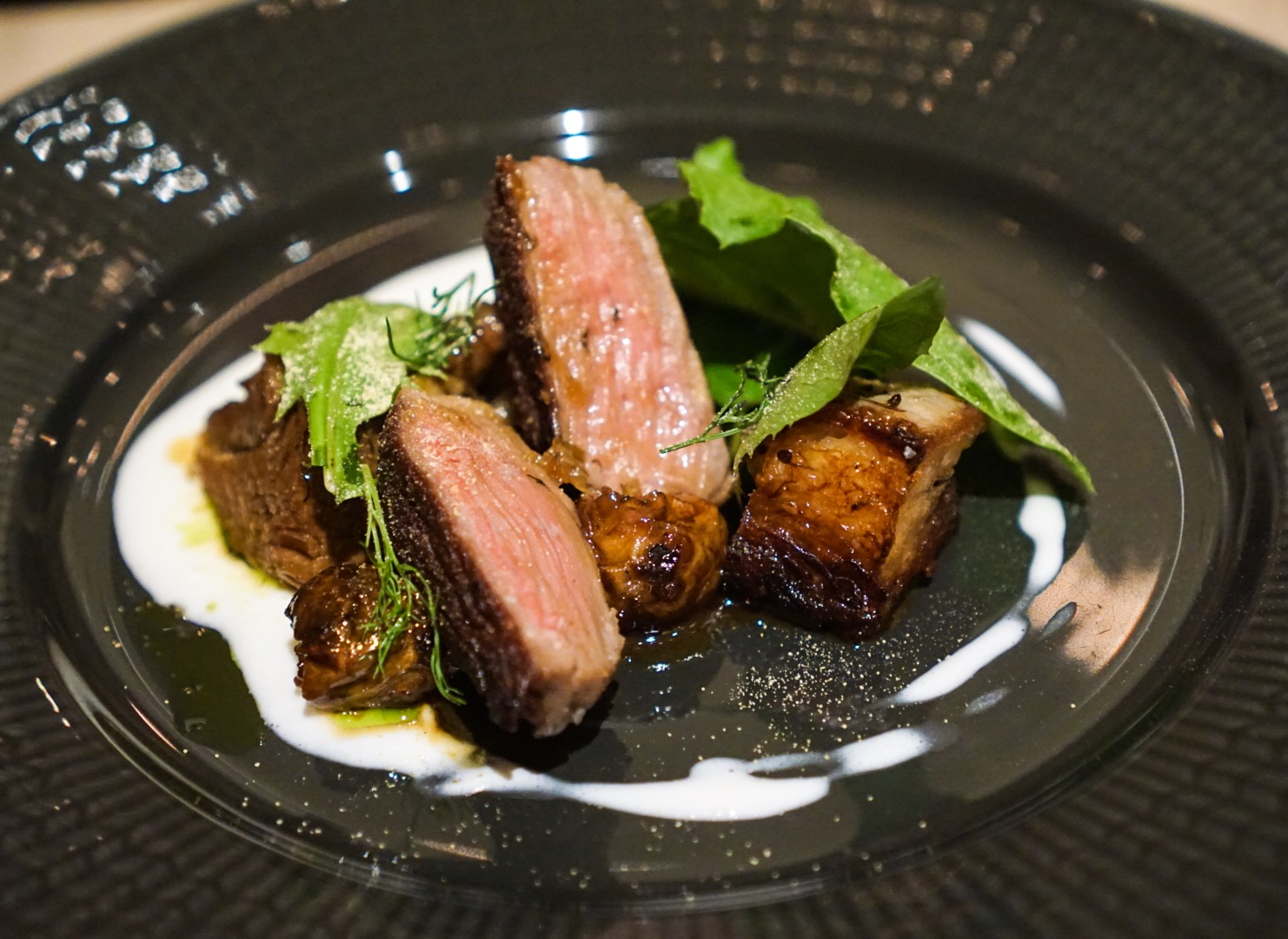 There is an a la carte option, but the main appeal here are the tasting menus dubbed “Land + Sea” (with meat) and “Field + Forest” (without). Both are seven course deals preluded by five “snacks” that guarantee you’re not going home hungry. Prices are steep at $145 for Land & Sea and $125 for the vegetarian, but they do include gratuity. Interestingly, less the half the dishes are actually different. But of course I did not pass on the meat. Here’s what arrived: