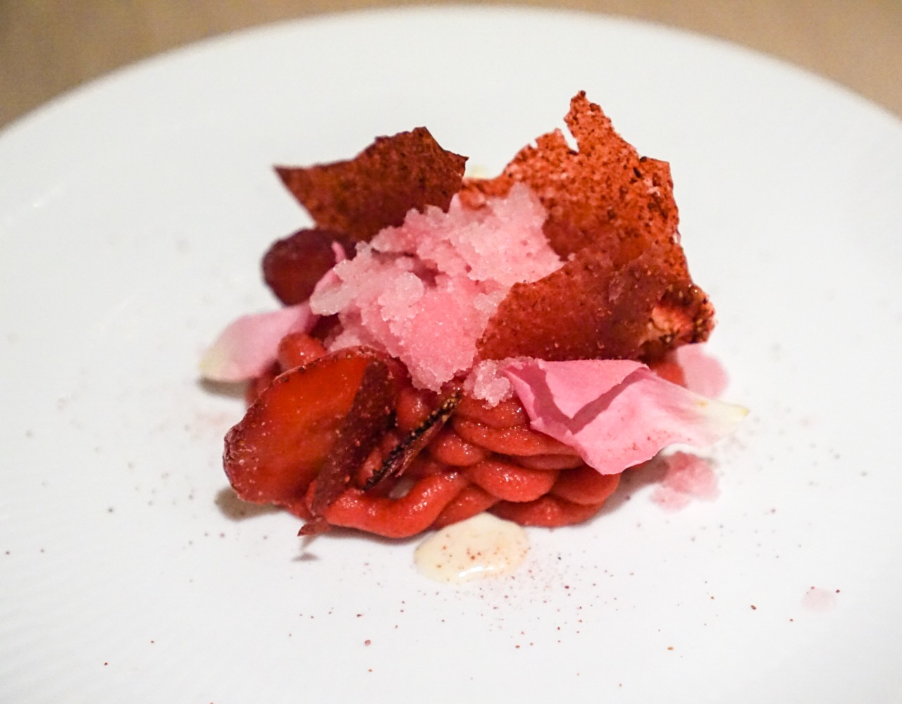 Strawberries We ended up receiving a bonus dessert not on the menu which included strawberries in various states including iced, freeze dried and normal. It was a refreshing change from the pine but unfortunately the freeze dried berries were a little too hard and cold.