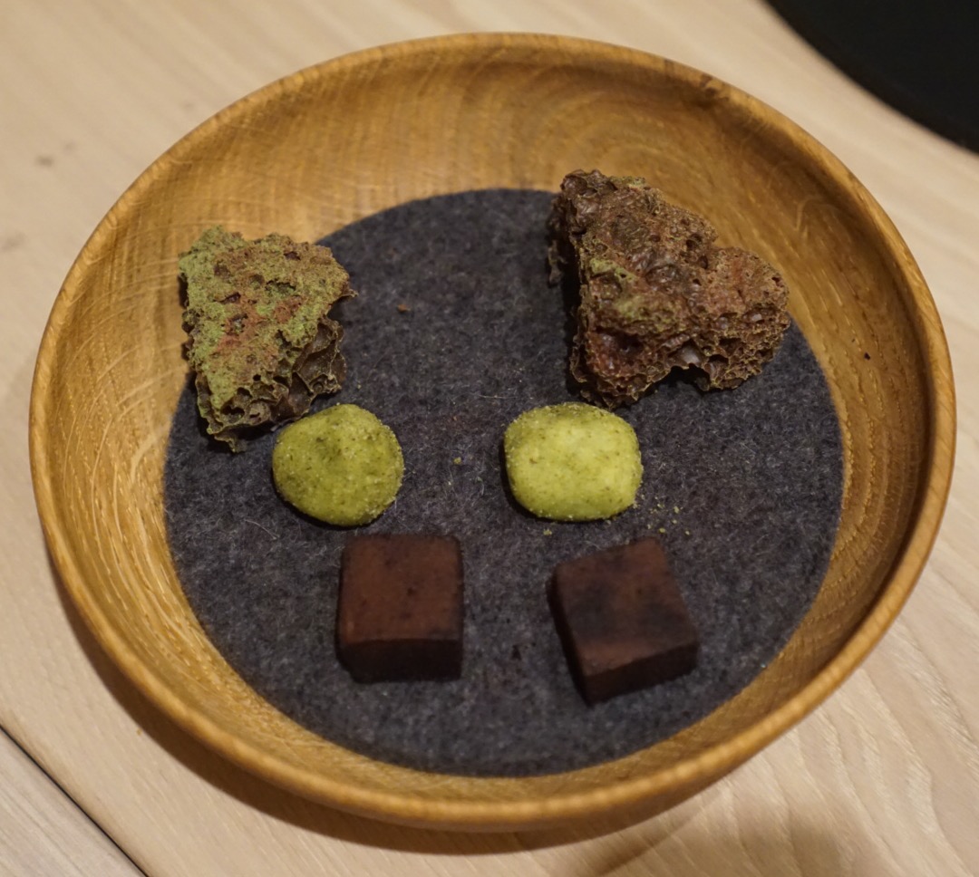 Petit Fours The meal concluded with a selection of more sweets including the moon rock-like piece of aerated chocolate, an ivy truffle and a more typical chocolate. The moon rock was my favorite.