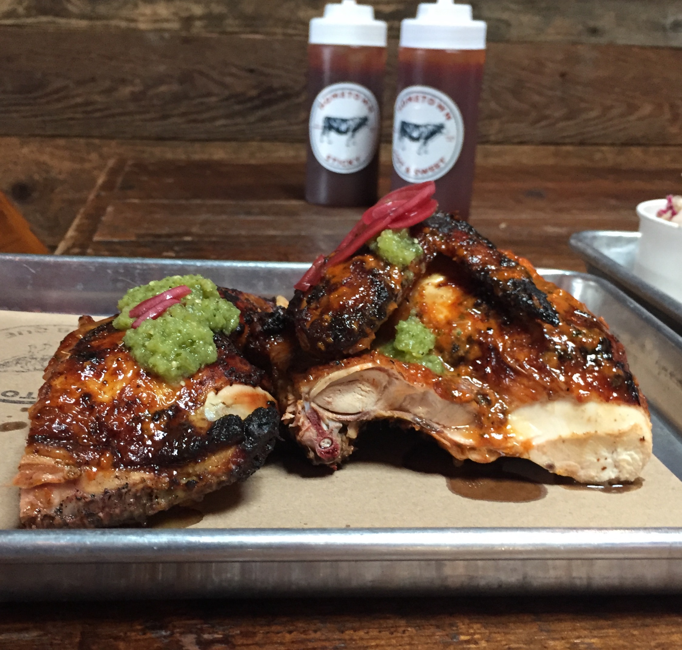 Normally the chicken at a barbecue place is reserved for the guy who has a serious cholesterol problem from years of a smoked meat diet. But here it’s a legitimate option. Its comes in a sweet & spicy Oaxacan marinade with a salsa verde and pickled red onion. Feel no shame in ordering it.