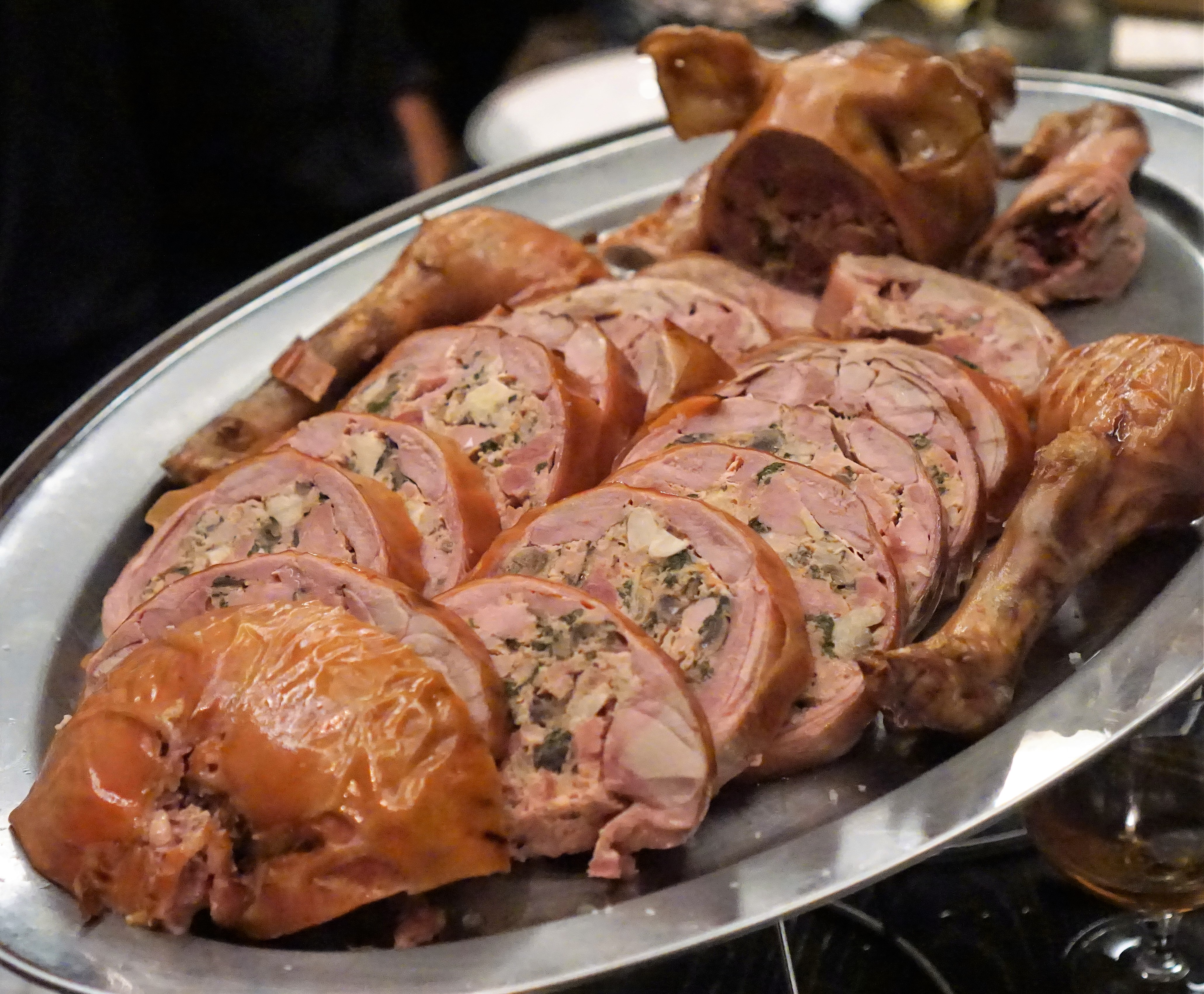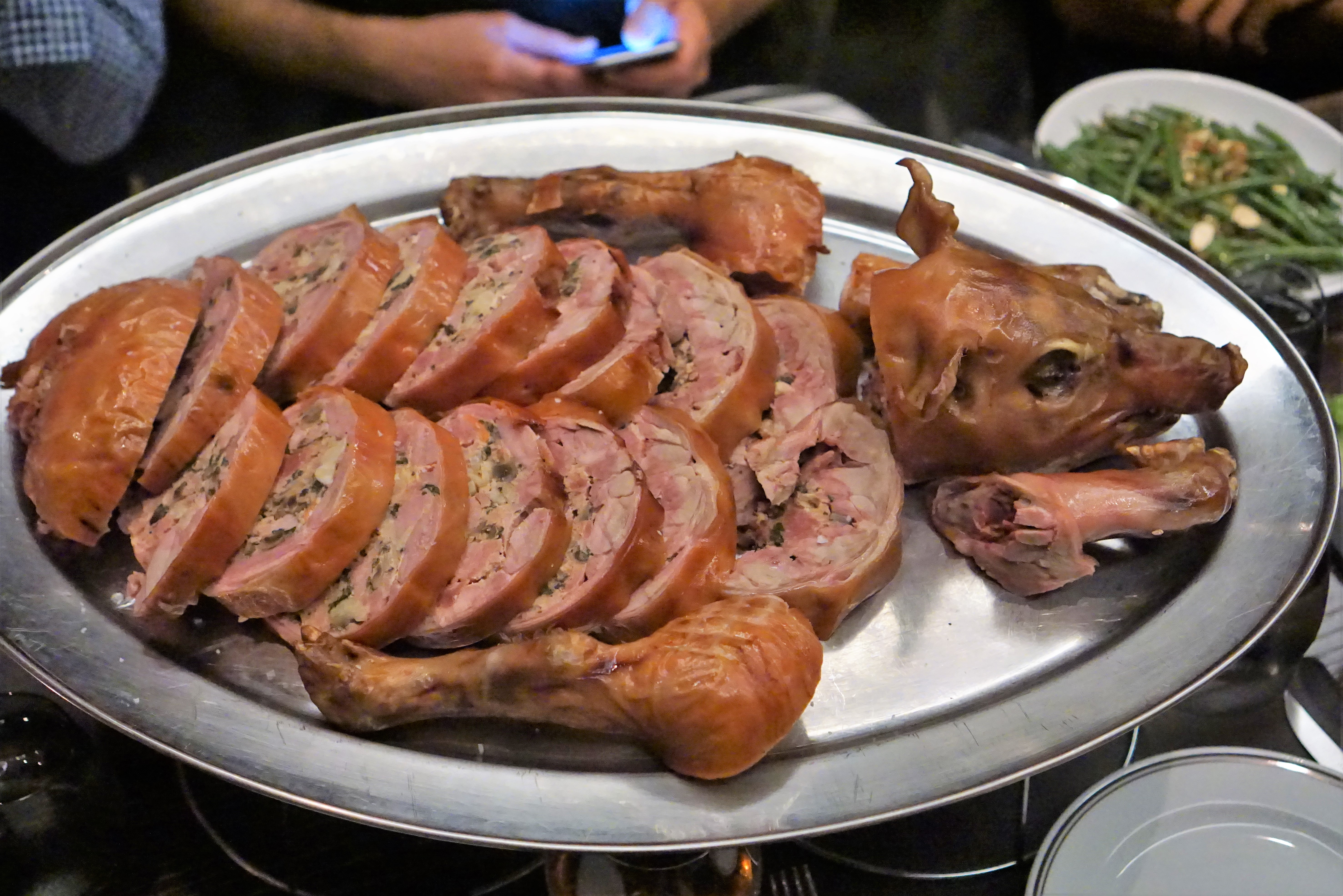 The word “PIG” rings through the air and suddenly an army of waiters is carrying a full roasted pig from the kitchen to your table. So if you don’t like being the center of attention you might want to skip this one. After presentation and inspection, the heifer is returned to the kitchen where it’s cut into thick slices before being returned to the table. As you can see it’s not actually just cut up, but made into basically a giant sausage with the meat mixed together with roasted tomato, wild mushrooms and swiss chard. It’s a completely different approach that creates a unique flavor and sets it apart from other pig roasts. Bonus: you also get the pork rinds to snack on on the side.