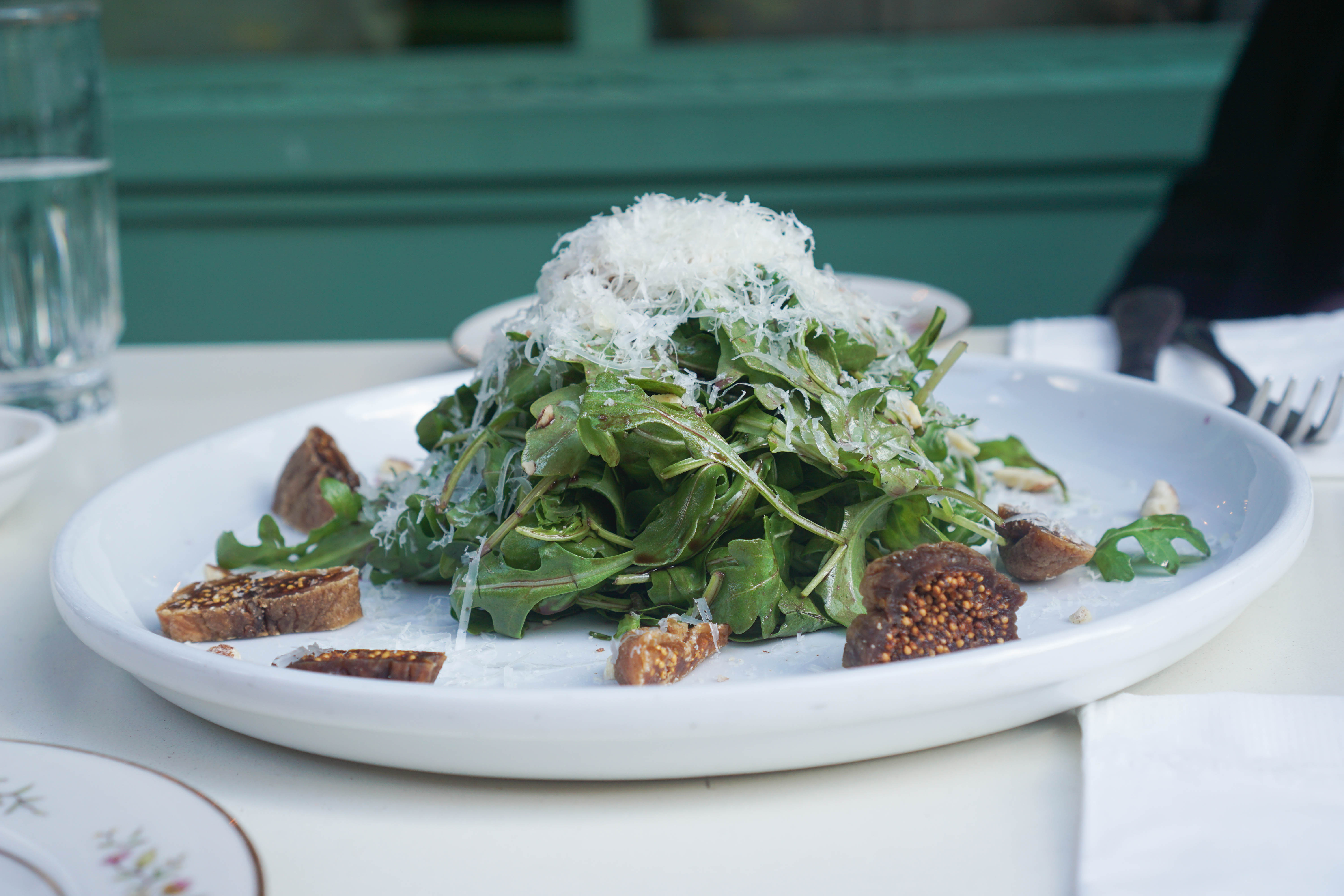 Arugula and Figs Salad Sometimes you need to eat some greens. It’s best that those greens are topped with cheese. Figs and almonds provide a nice sweet-salty balance.