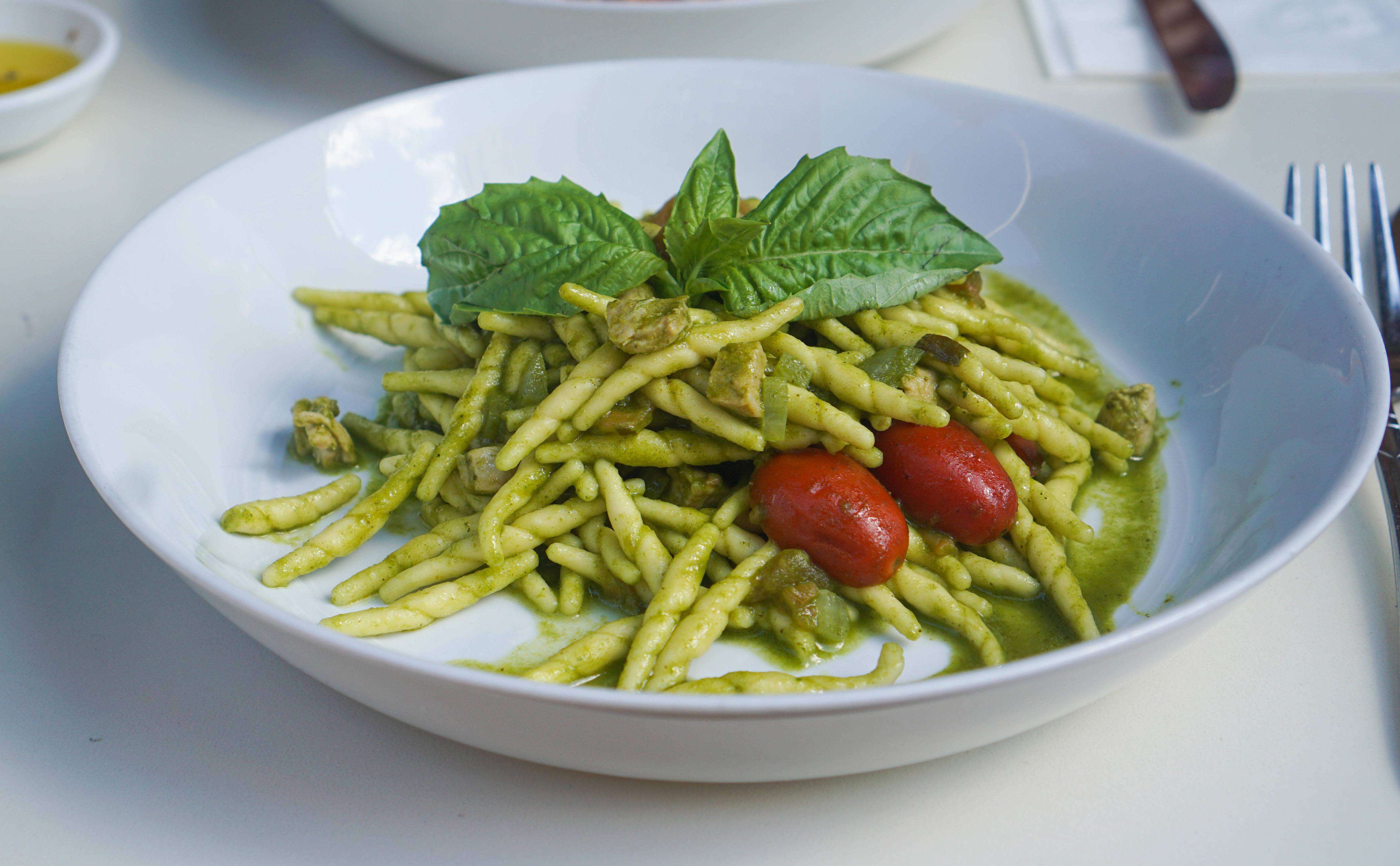 Trofie Carloforte I loved these chewy al dente trofie sticks. They come in a refreshing basil pesto with a little tuna that was perfect for one of the last days of summer.