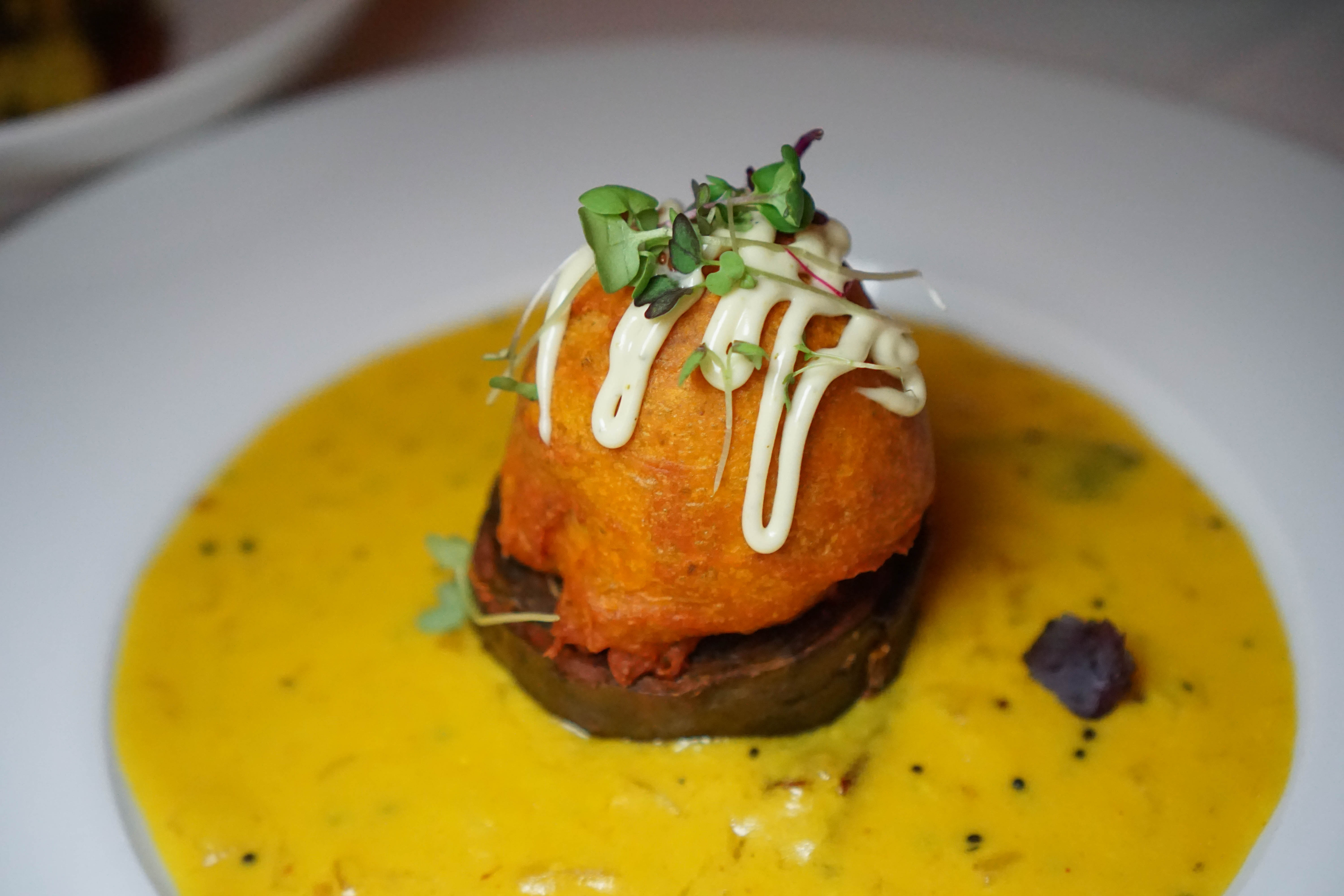 Patra Khumb (steamed colocasia leave chickpea cake, mushroom, herb potato yogurt sauce) I think this perfectly represents the delicate combinations Chef Eric is building here. Sadly it gone in a few fun, flavorful bites.