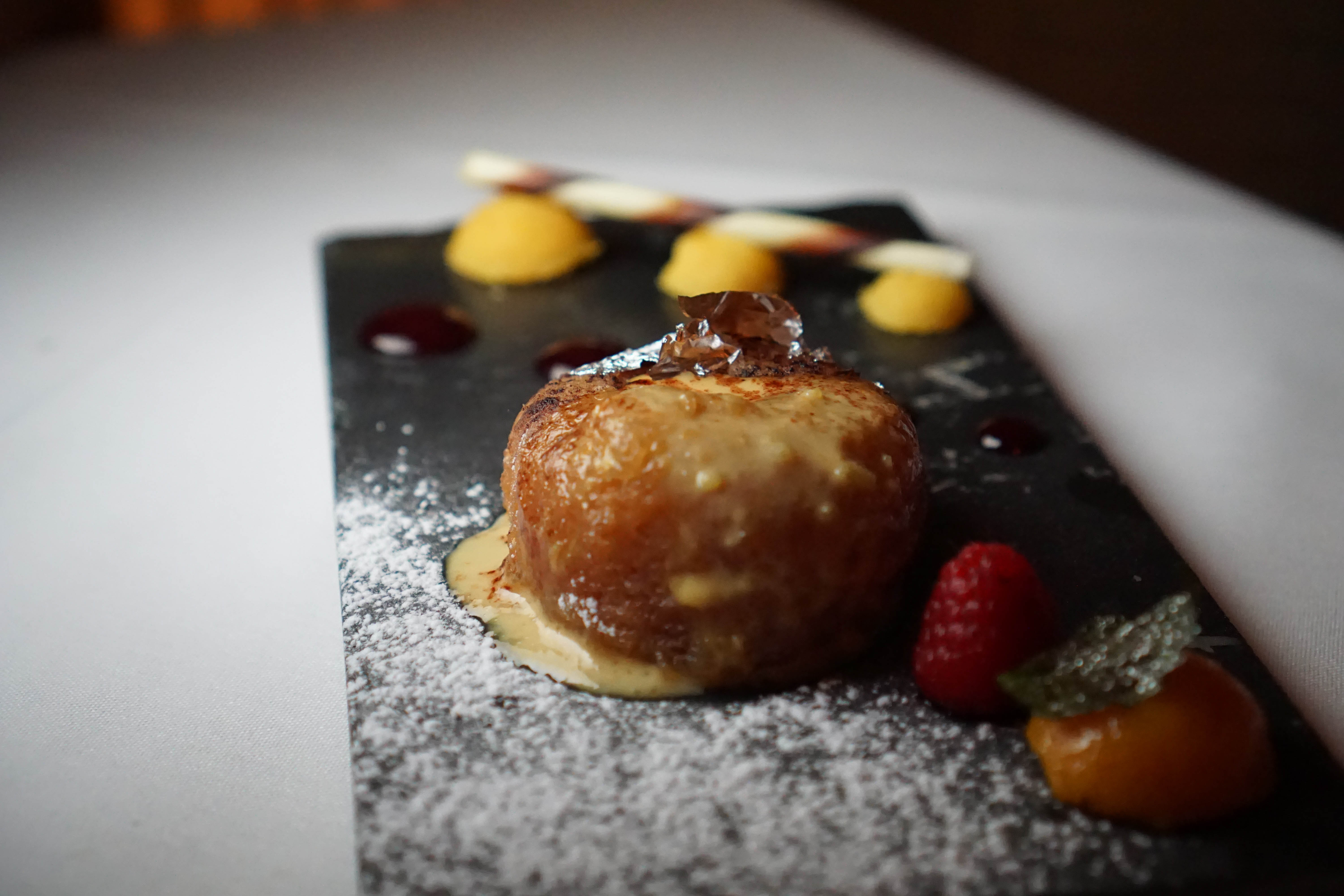 Balushahi Sheera (light Flaky Indian doughnut, semolina, black currant coulis) Dessert is another after thought at Indian restaurants, but Eric set out to fix that. It starts with this doughnut, which reminded me of of the Indian sweets you find all over the streets of that country. There’s silver leaf on top and semolina inside with a tangy black currant coulis. The light texture and slightly sweet taste makes it a perfect end to a hearty spicy meal.