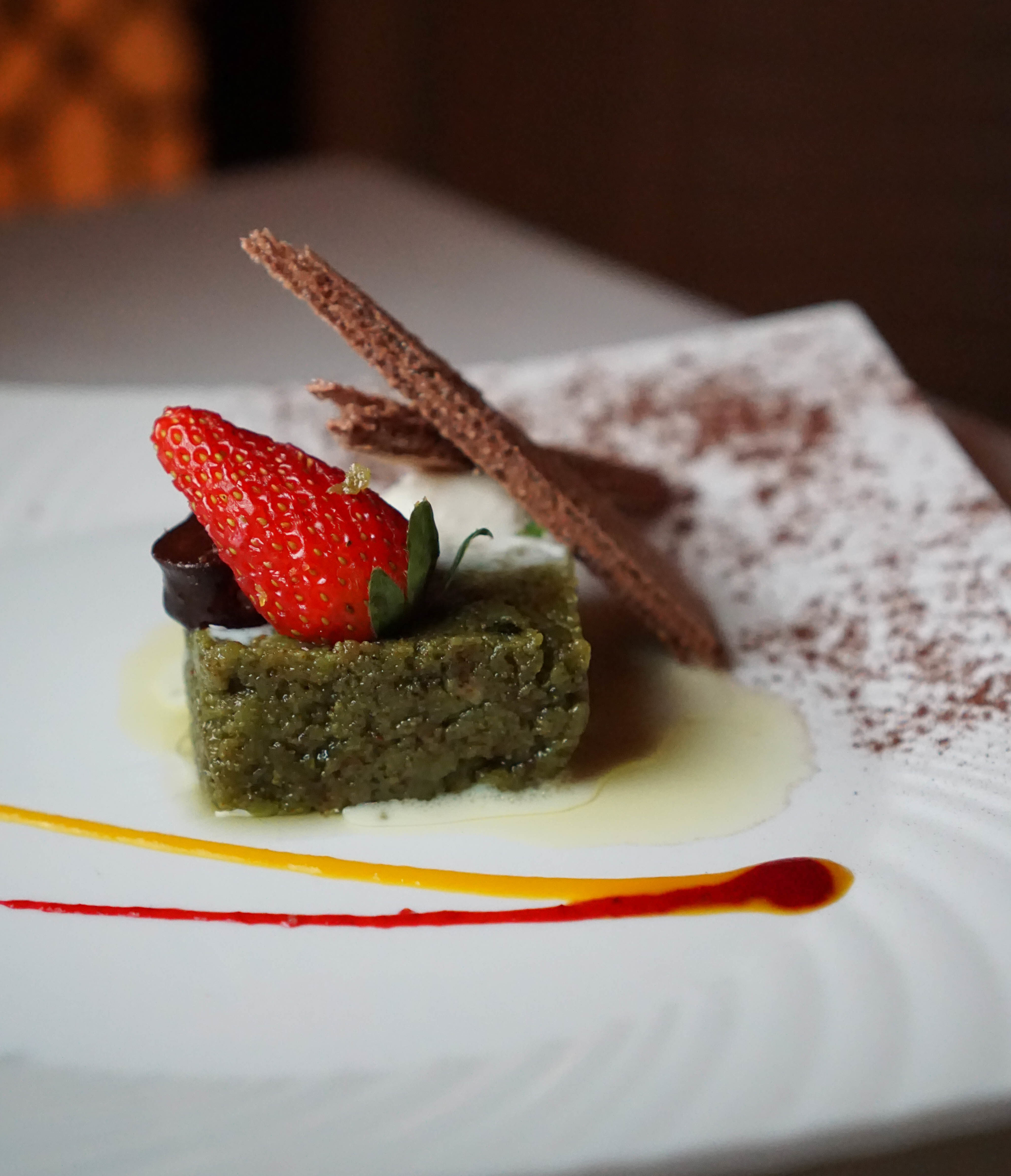 Lauki Halwa That green cake is a pumpkin cardamom candy. It’s topped with vanilla and ice cream and chocolate. Another fun few bites to end the meal.
