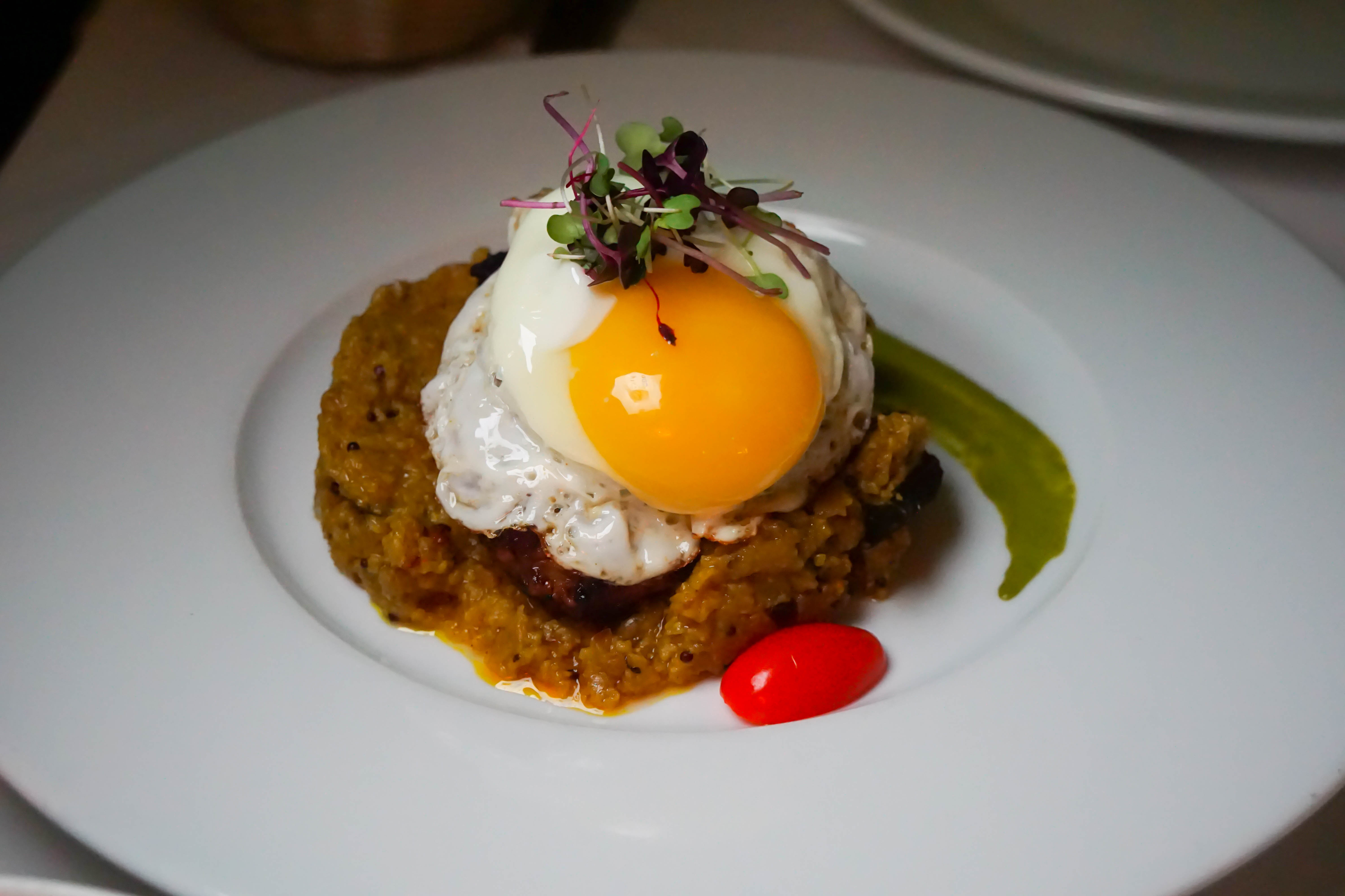 Chelow Kebab (Tandoori Lamb tenderloin seasoned with cinnamon, cumin, served with saffron grits, baked egg, and mint emulsion) You can barely see the lamb sandwiched between the egg and saffron grits which is a damn shame because it’s amazing. Sweet, nutty and spicy from the cinnamon and cumin it’s the best lamb I’ve had in an Indian restaurant.