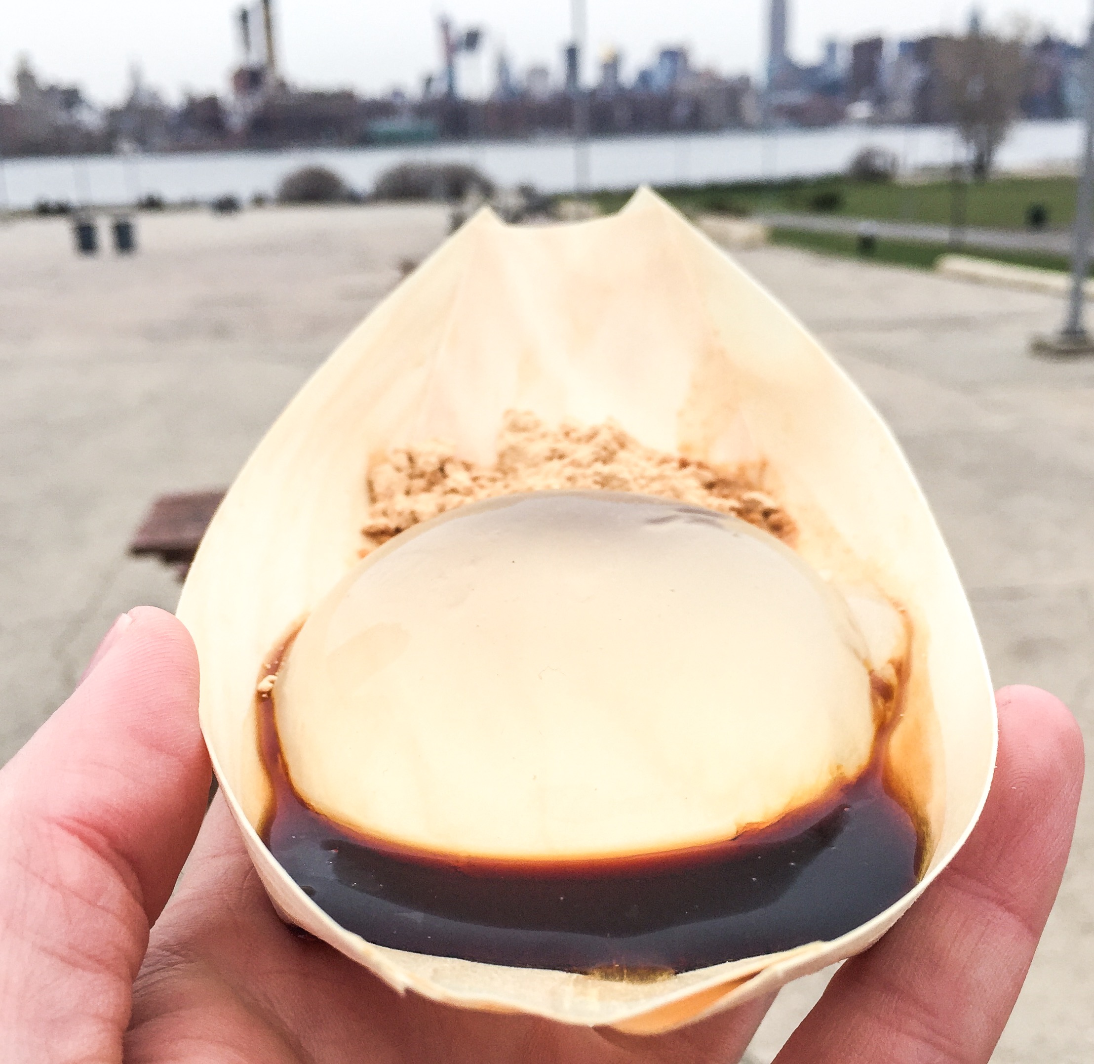 This 2016 newcomer took the internet by storm so I’ll put it up top for now even if it’s not actually the best tasting thing at the ‘burg. The center is made of only water and agar (an algae based gelatin) and has the look and consistency of, well, watch the video and see for yourself. The flavor comes from soybean flour and brown sugar syrup which essentially gives it that taste of a flan jello. It’s also vegan.