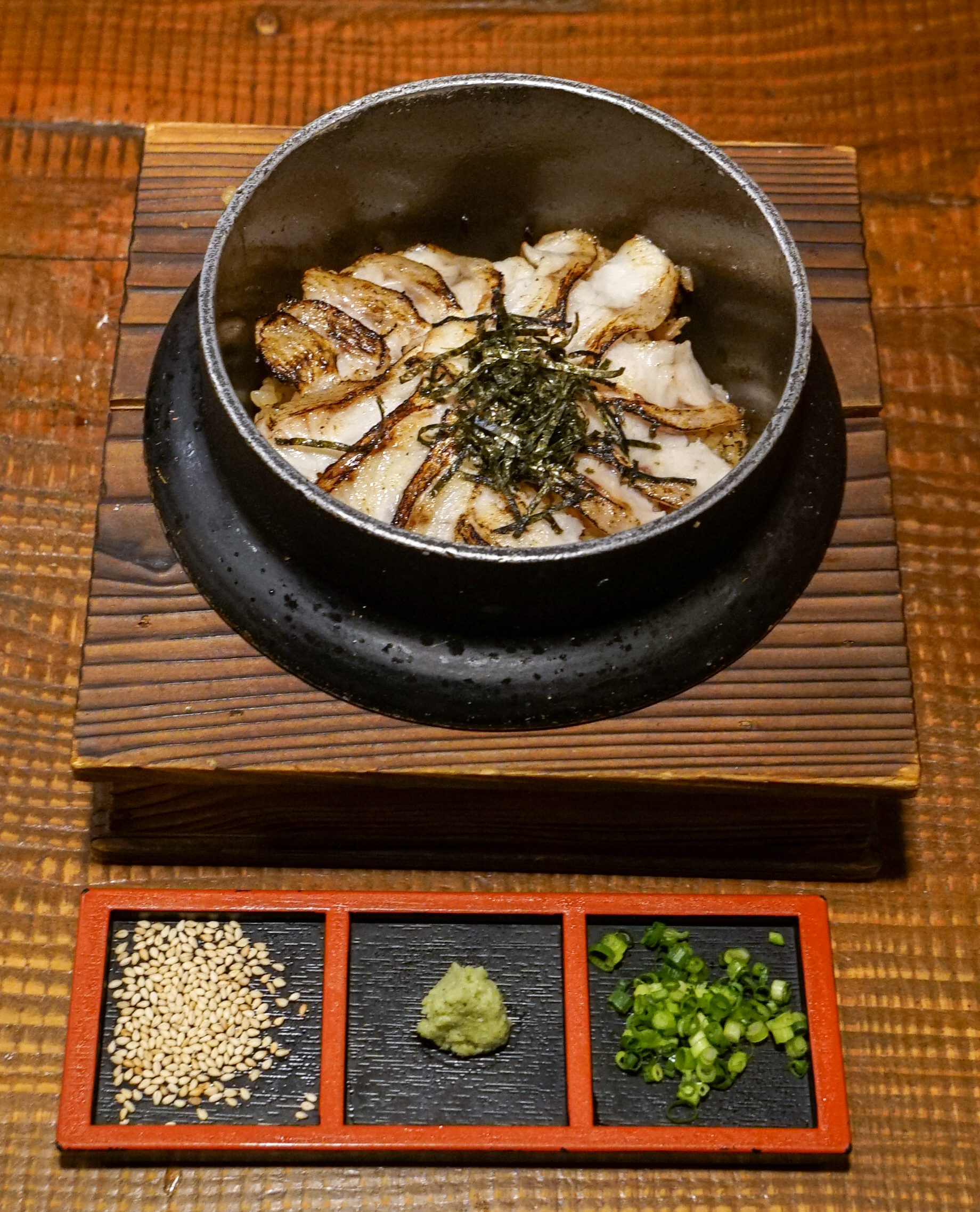 Nodoguro (aka “Rosy Sea Bass”) is a fish caught solely in the Sea of Japan. This izakaya in Kanazawa (which happens to rest squarely on this sea) specializes in the fish. The classic preparation is to char the nodoguro and eat it three ways: on it’s own over rice, with the accompanying wasabi, sesame seeds and scallion and then pour on a dashi broth to create a soup. I enjoyed all three methods, but I found the broth overpowered the the rich taste of the bass.