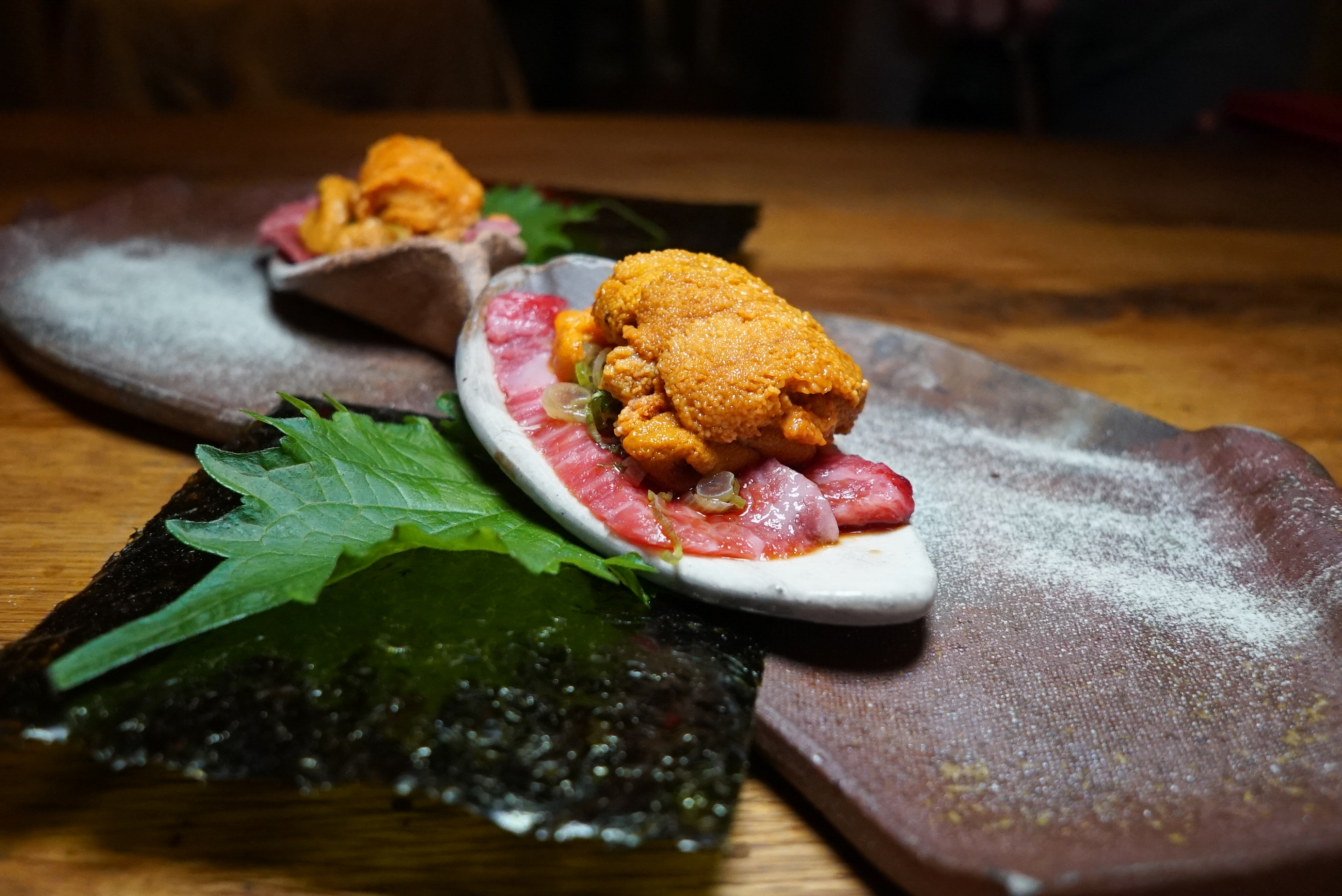 Uni & Wagyu Beef Roll Uni and Wagyu are two of my favorite things. Add shiso and you’ve hit a trifecta. Then as a bonus you get roll roll it up yourself like a little taco. Start your meal here.