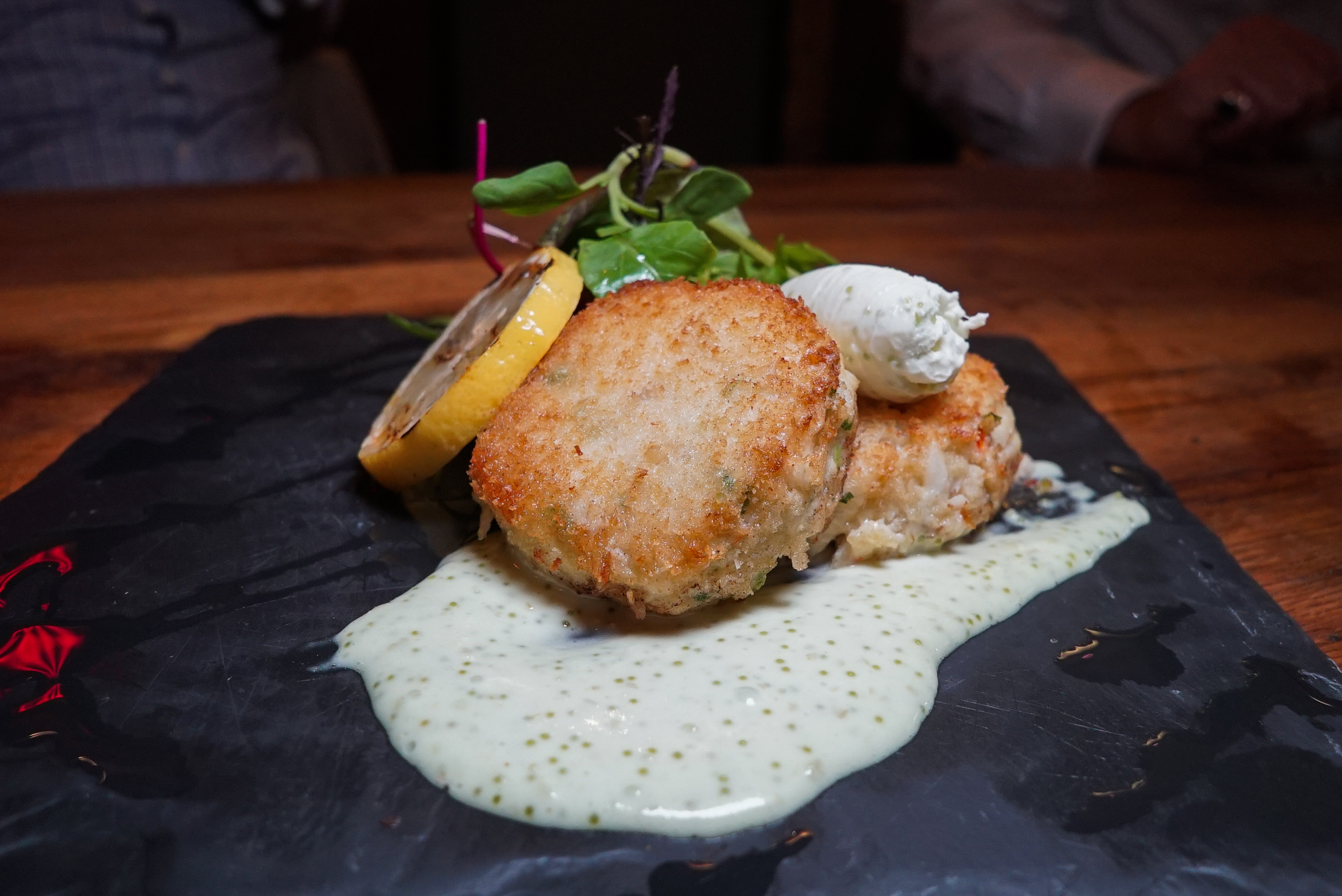 Crab Cakes The less filling in a crab cake the better. This guy is almost all crustacean and comes with a wasabi cream sauce.