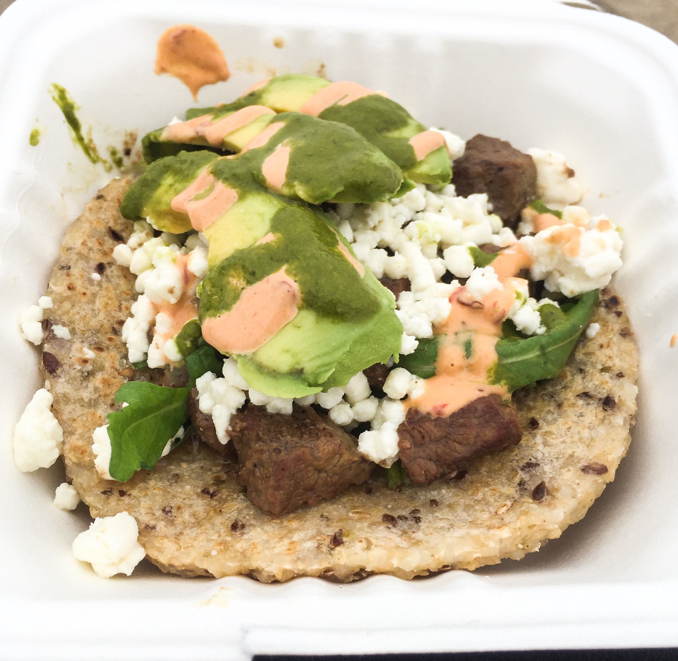 Toro Arepa @ Palenque One of the first places I’ve seen to offer “healthy” apreas – this is a multigrain arepa topped with beef, cheese and of course avocado. They also offer traditional and quinoa based arepas. This 4″ size is perfect for a few bites when coming doing a Smorgasburg tasting.
