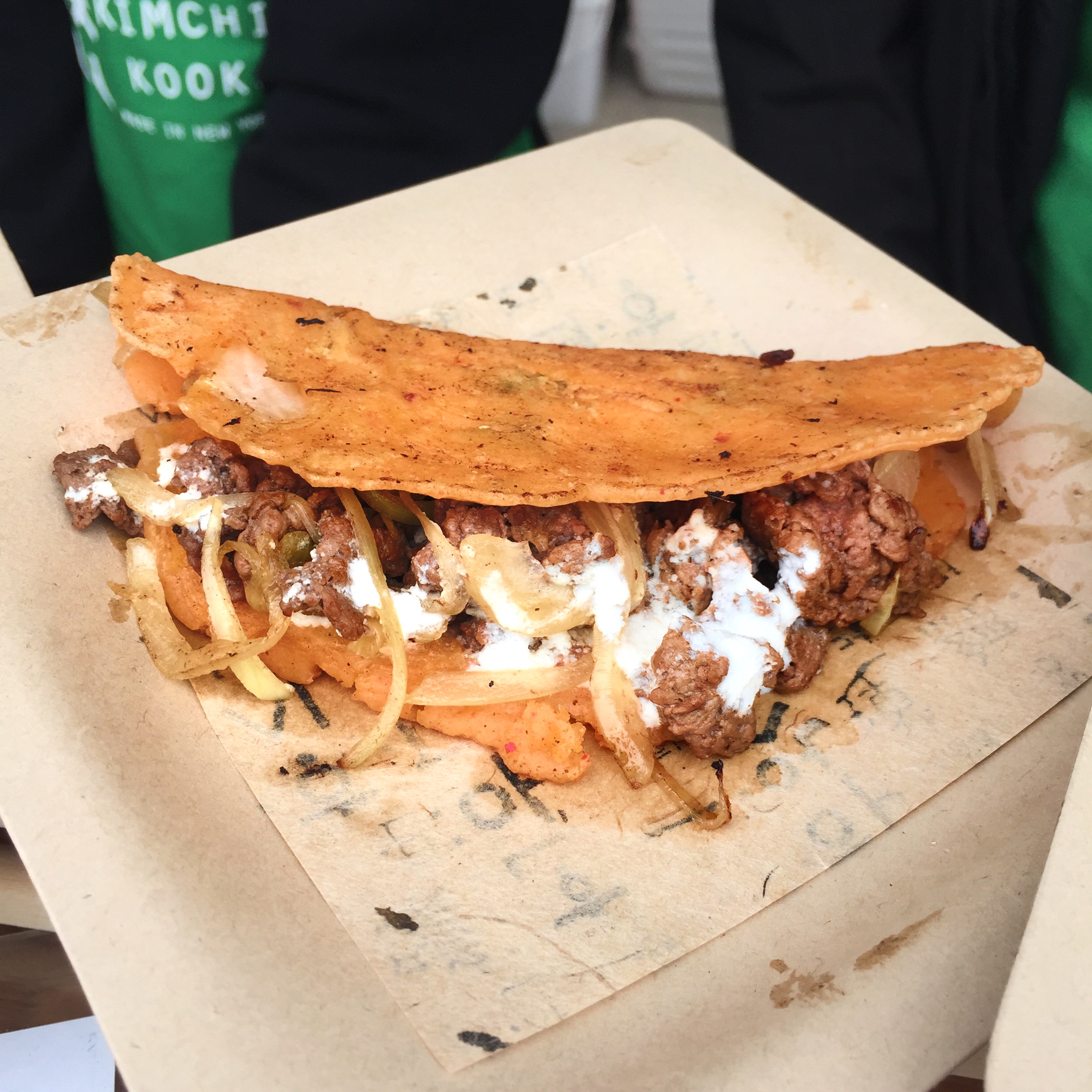 Stuffed Kimchi Pancake & Mungbean Pancake @ Kimchi Cooks The stuffed kimchi pancake contains beef, onions, ricotta and their signature kimchi which is a perfect mix of tang and spice. The pancacke consists of mung beans, kimchi and scallions (and no eggs!) it makes for a spicy, tangy and reasonably healthy Smorgasburg snack.