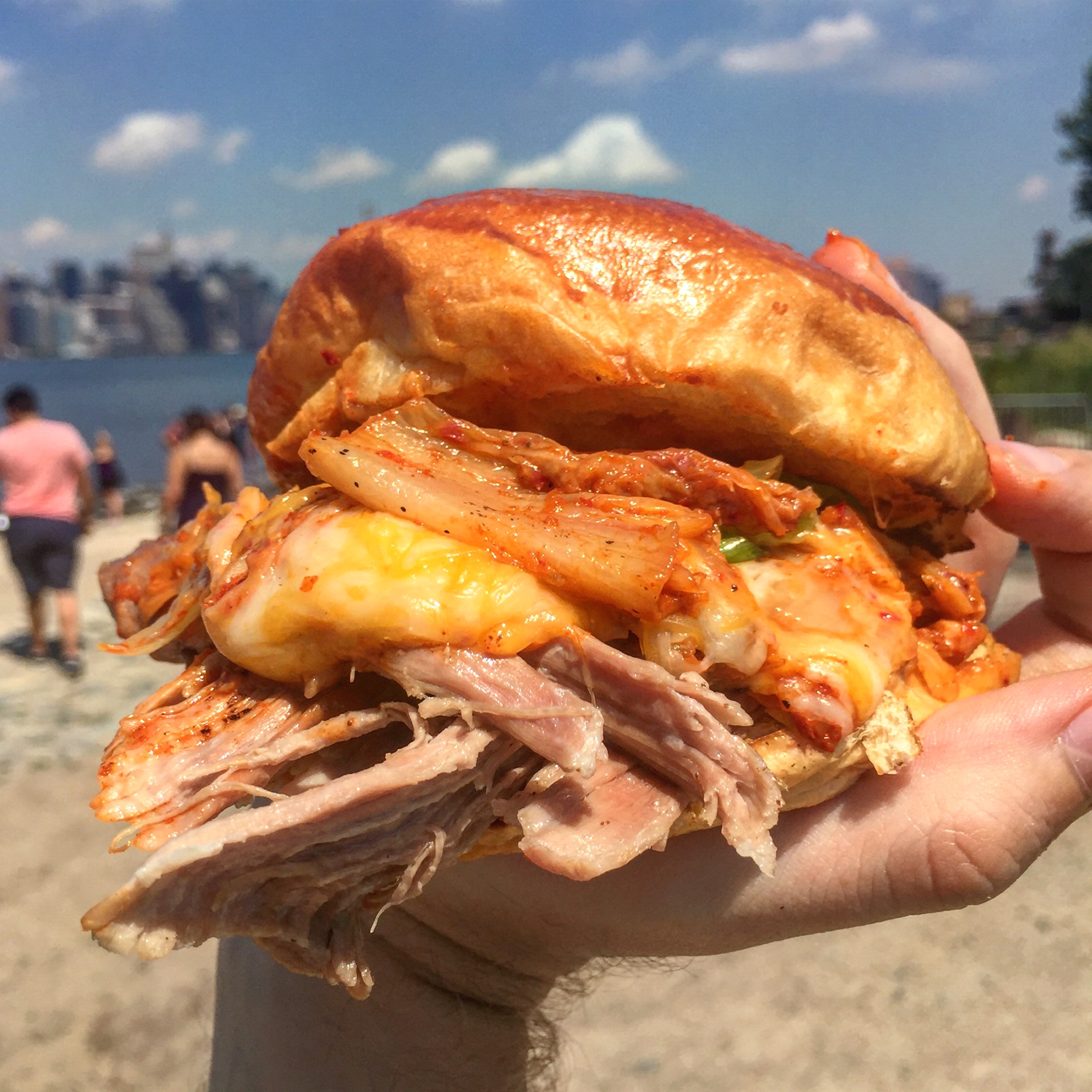 Cholander Sammie @ Kimchi Smoke This behemoth is well worth the $14 price tag. Smoked pork shoulder comes smothered in cheese, kimchi and their signature Fatboy BCS sauce. It’s the best way to ensure you leave Smorgasburg in a food coma.