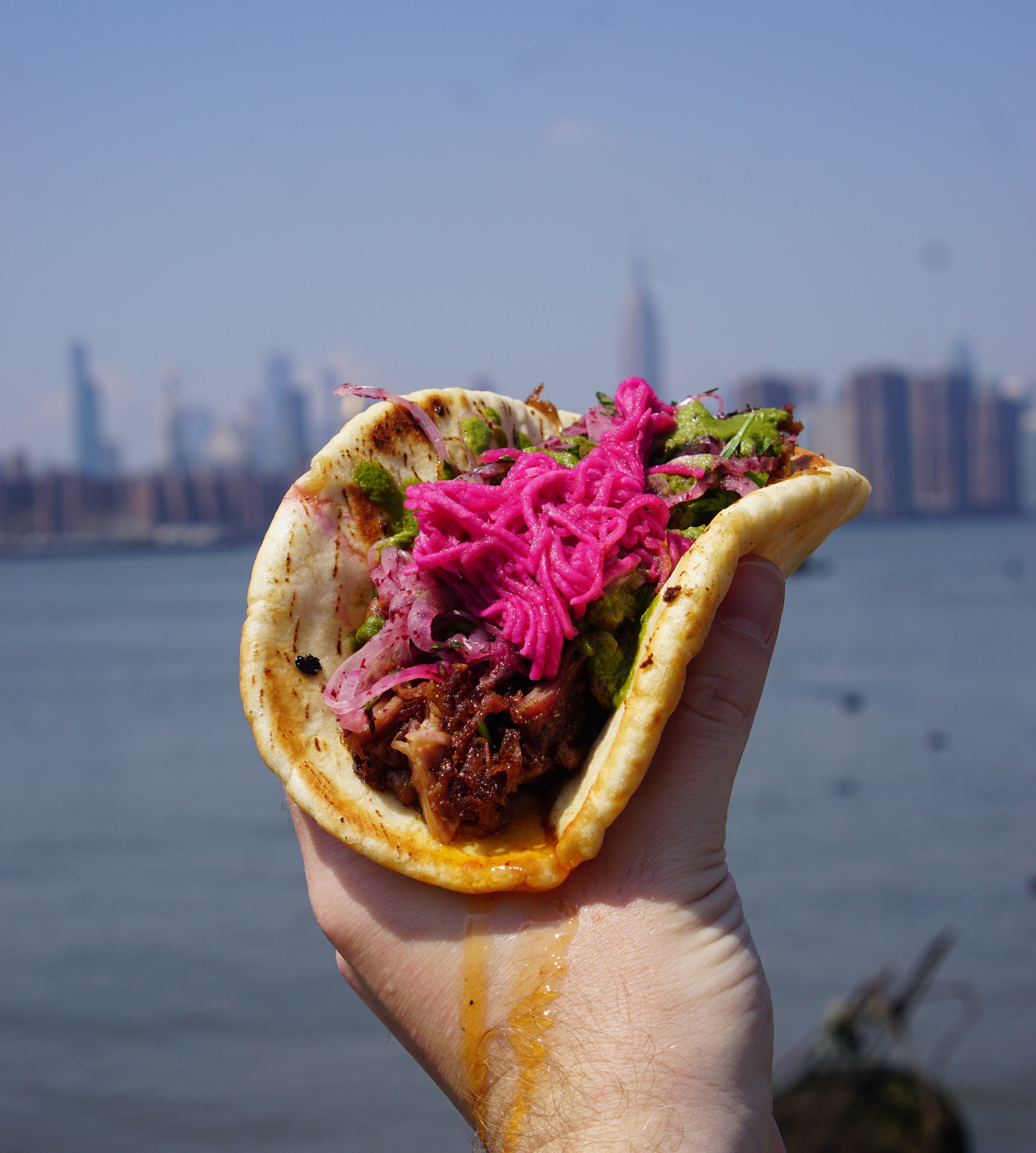Pork Shawarma Taco @ Boutros Fusing two great foods into one works better sometimes than others (sorry smoked salmon pizza). This is one that works. Crispy, juicy pork topped with pickled beets & turnips and Zhug sauce, which is basically a Middle Eastern chimmichurri to begin with. If any of those things appeal to you, make this one of your first stops at Smorgas in 2018.